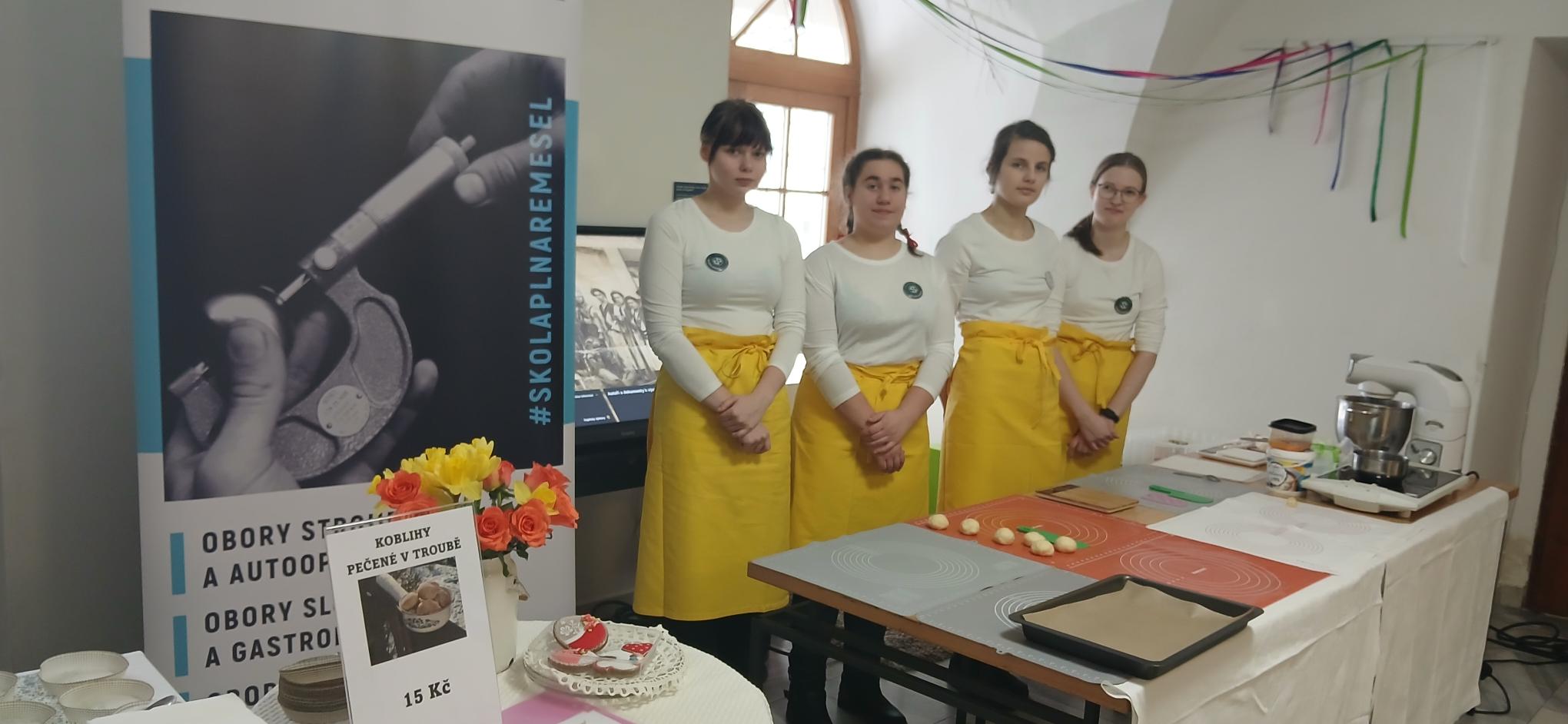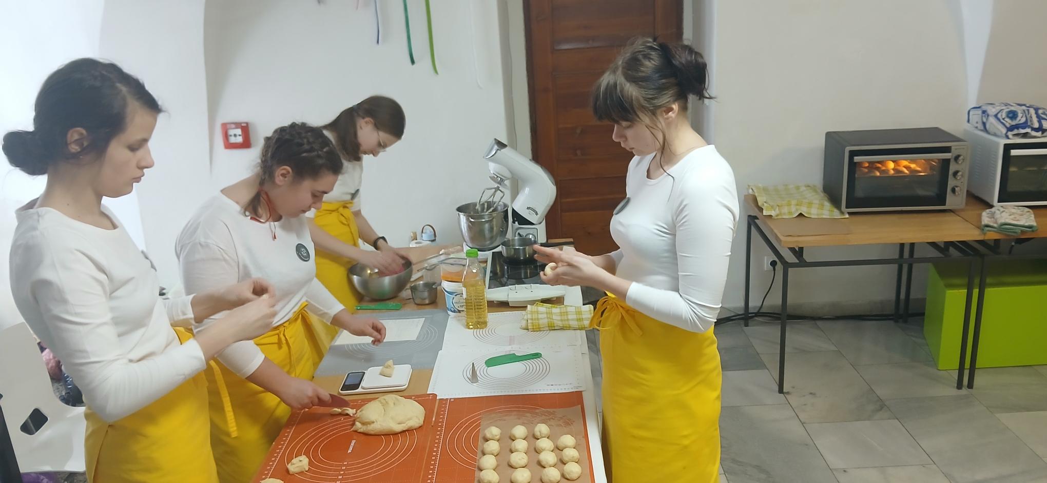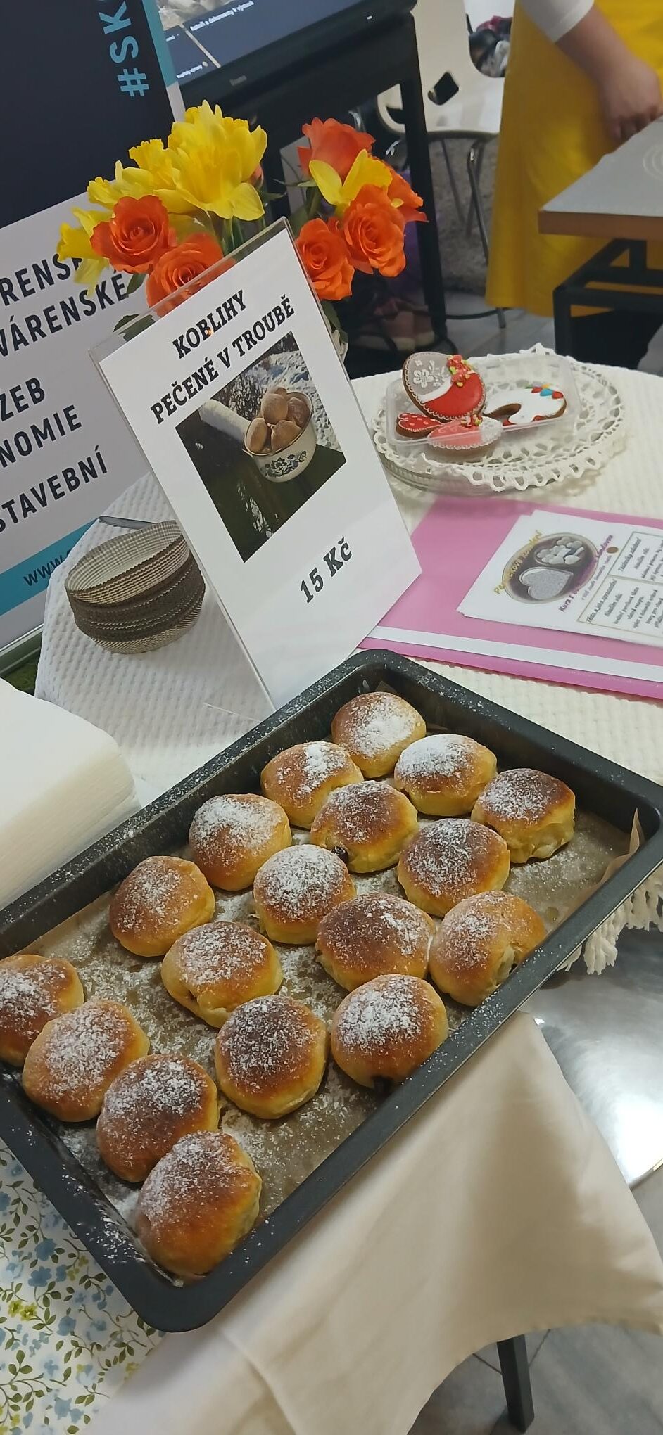 V netradičních prostorách jsme si připravily improvizovanou cukrářskou dílnu, chystaly těsto a po vykynutí tvarovaly a pekly kolihy, které jsme pak i plnily povidly. I když podmínky nebyly přímo perfektní, trouby si občas dělaly, co chtěly, vše jsme zvládly a pochvaly od návštěvníků, byly pro nás velkou odměnou.